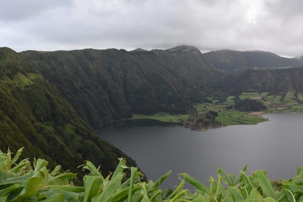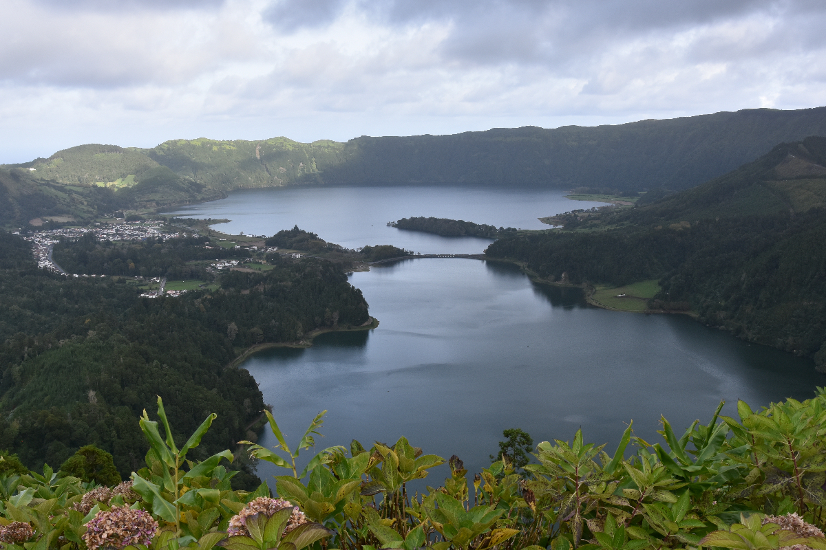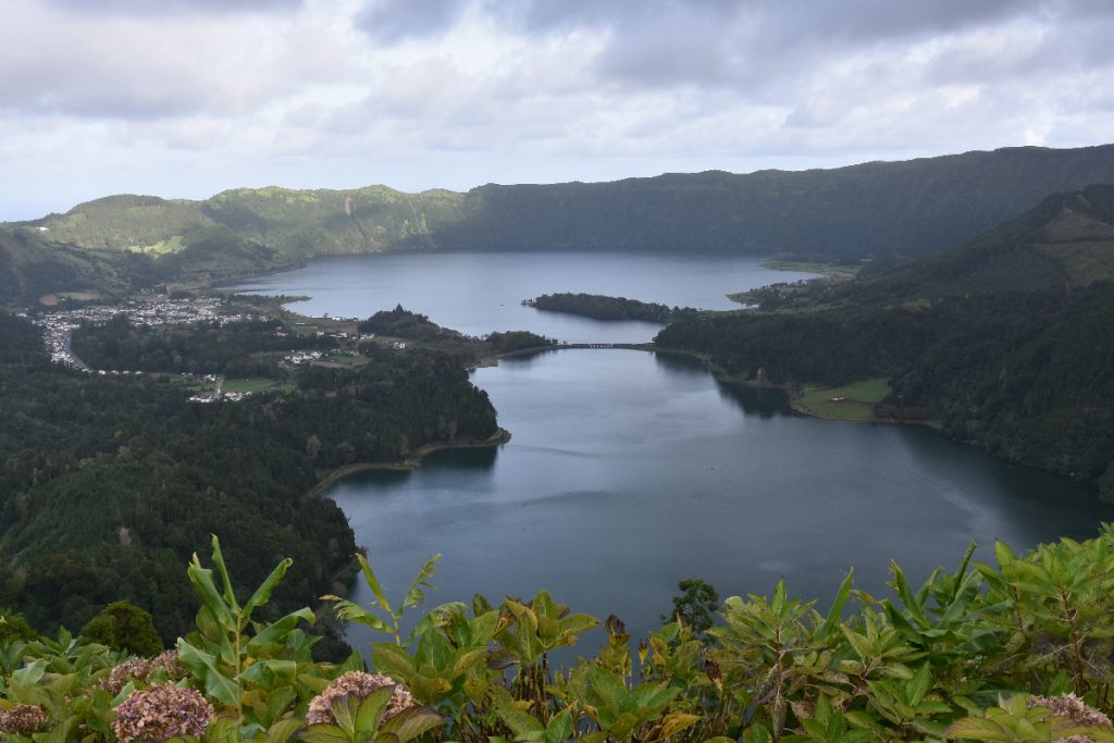 An einem Aussichtspunkt am Kraterrand schauten wir dann hinunter in die Caldeira mit den Seen. Hübsch sah es aus, aber die Sonne hat nicht so direkt ins Wasser geschienen, so dass man die grüne beziehungsweise blaue Färbung erkennen konnte – schade.
