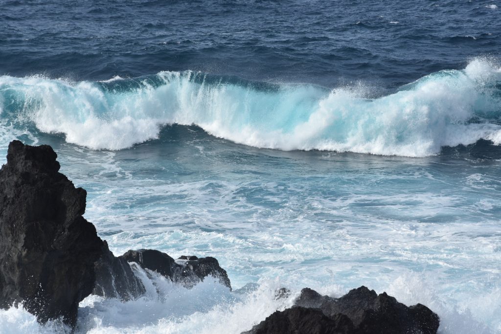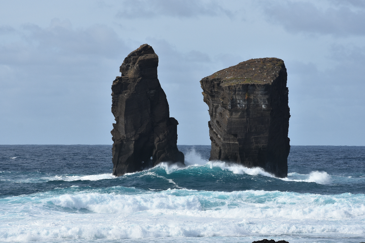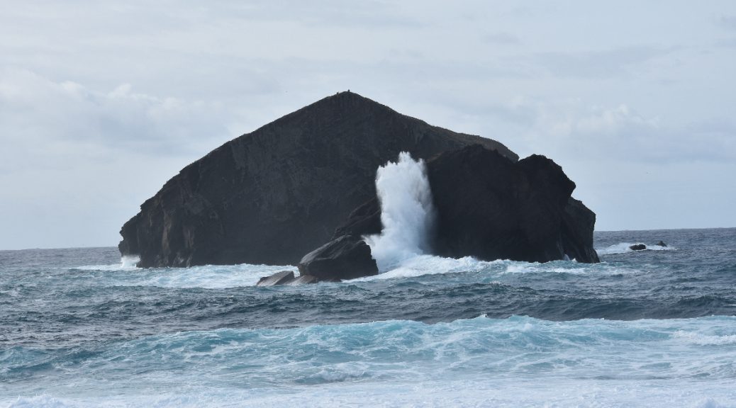 Dafür sind in den Krater hinunter gefahren zu den Seen, haben die Caldeira durchquert und sind wieder hoch an den Rand auf der anderen Seite. Von dort hatte man einen Superblick auf die wilde Westküste. An einigen Felsblöcken im Meer brachen sich große Wellen: Das liebe ich total!
