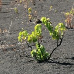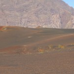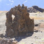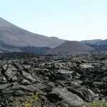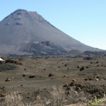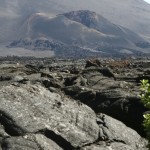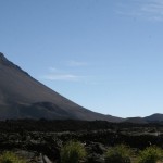Rechts der Blick auf die Steilwände der Bordeira, in der wir auch Basalt entdeckt haben, links die gewaltigen Lavafelder mit dem Pico de Fogo und später auch dem Pico Pequeno im Hintergrund mussten wir dann über ein Lappilifeld, um wieder zur Fahrstraße zu gelangen. Die Hitze flimmerte darüber. Es war schön anzusehen wegen der verschiedenen Färbungen, allerdings hat es uns auch reichlich heiße Brisen ins Gesicht geweht.