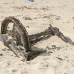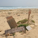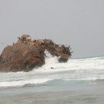 Und dann das Highlight: Ein Wrack. 1968 gestrandet, liegt es seitdem in der Brandung der Costa de Boa Esperanca. Auf älteren Bildern konnte man den Bug noch sehen: Heute ist er schon fast abgetragen. Die Ladung wurde mittels Winden geborgen: Eine dieser Winden liegt noch am Strand. Überhaupt liegen an dieser Küste viele Wracks: Einmal durch Strömungen bedingt, durch die Riffe und angeblich starke erdmagnetische Felder haben einige Schiffe Schiffbruch erlitten. Man munkelt allerdings auch, dass die Bevölkerung durch das eine oder andere „Leuchtfeuer“nachgeholfen habe.