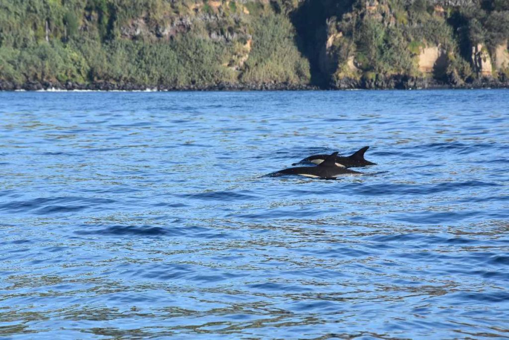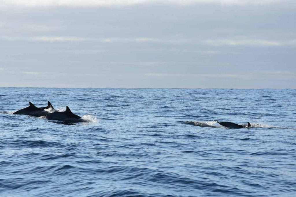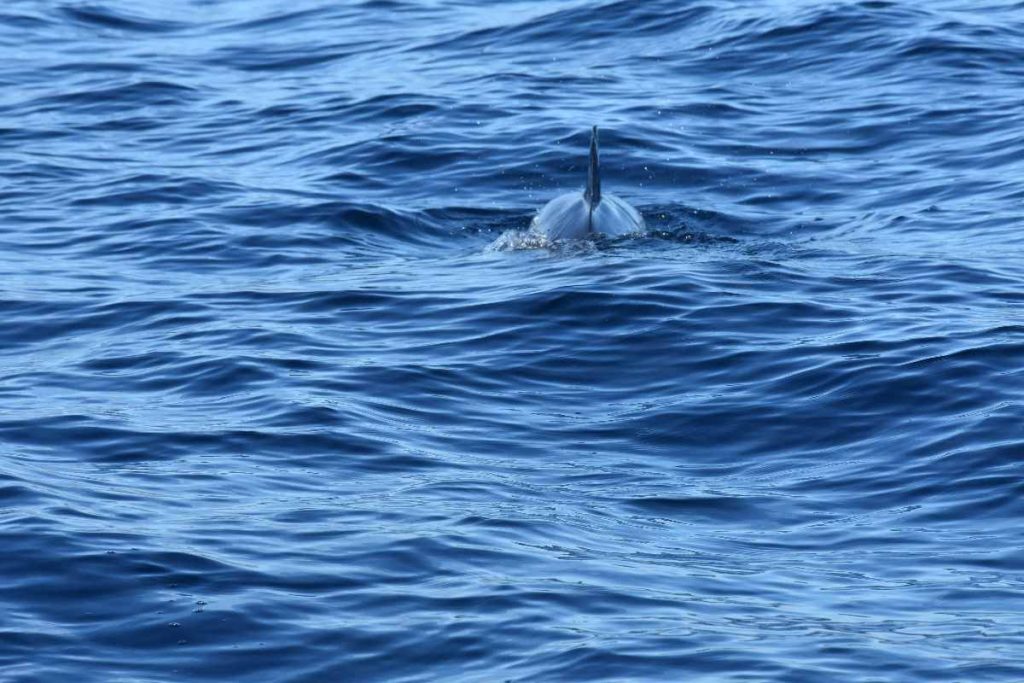 Zunächst haben wir eine Einweisung erhalten: Welche Tiere denn überhaupt zu sehen sein können in den azoreanischen Gewässern und eine Safety-Einweisung. Dann wurden wir auf zwei Schlauchboote verteilt und es ging los. Erfreulicherweise war es nicht so windig wie gestern, so dass das Meer relativ ruhig war. Und dann hat Lisa, unser Guide, die ersten Delfine gesichtet. Wir waren natürlich richtig happy, dass wir überhaupt etwas zu sehen bekamen.