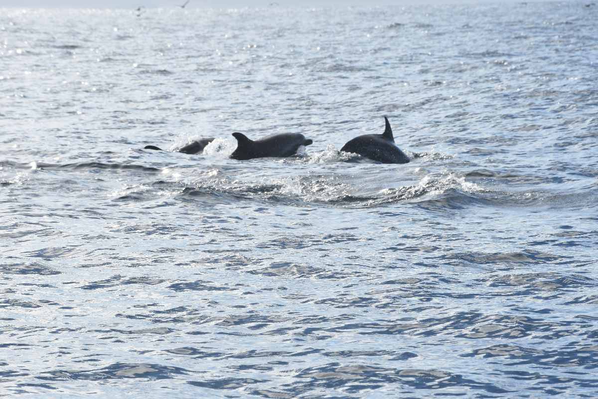 Wir drehten ab Richtung Küste: Dort sollten noch mehr Tiere zu sehen sein. Und wie viele: Lisa meinte, dass es bestimmt über hundert Delfine seien, die um uns herum schwammen. Tatsächlich waren der gemeine Delfin zusammen mit einem gefleckten Atlantikdelfin unterwegs. Letztere sind unterwegs Richtung Florida. Es war so schön, sie zu beobachten.