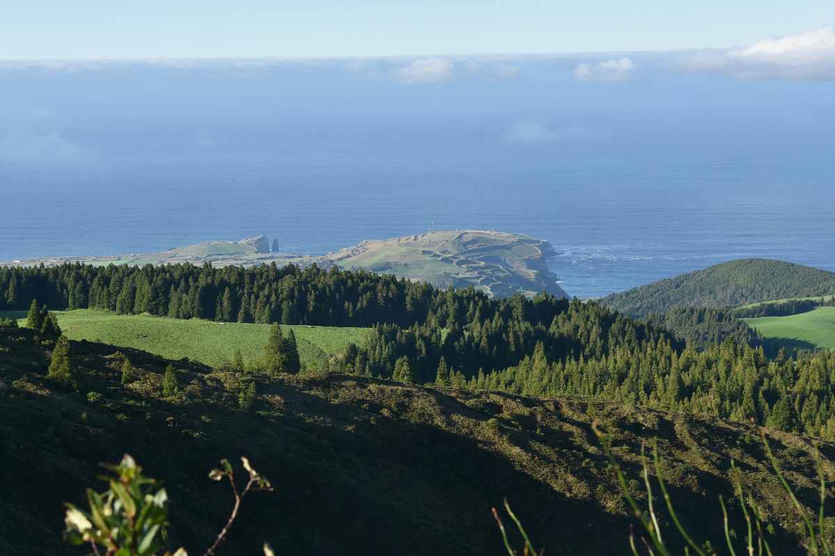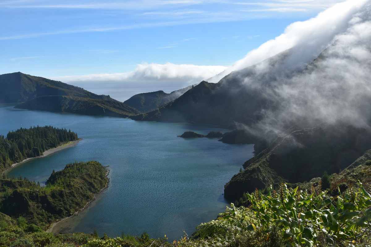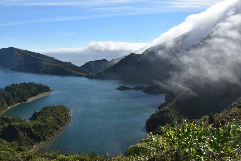 Wir haben spontan entschieden, das gute Wetter auszunutzen und zum Vulkansee Lagoa do Fogo hochzufahren. Das ist einer der drei größeren Vulkanseen. Oben angekommen pfiffen uns die Wolken wieder um die Ohren, aber immer wieder gab es Lücken, so dass wir einen fantastischen Blick auf den See mit toller Färbung erhaschen konnten. Es war eine ganz besondere wilde Stimmung mit den Wolken, die sich immer wieder fast in den See ergossen. Außerdem konnten wir immer wieder auch nach Ribeira Grande an der Nordküste runterschauen.
