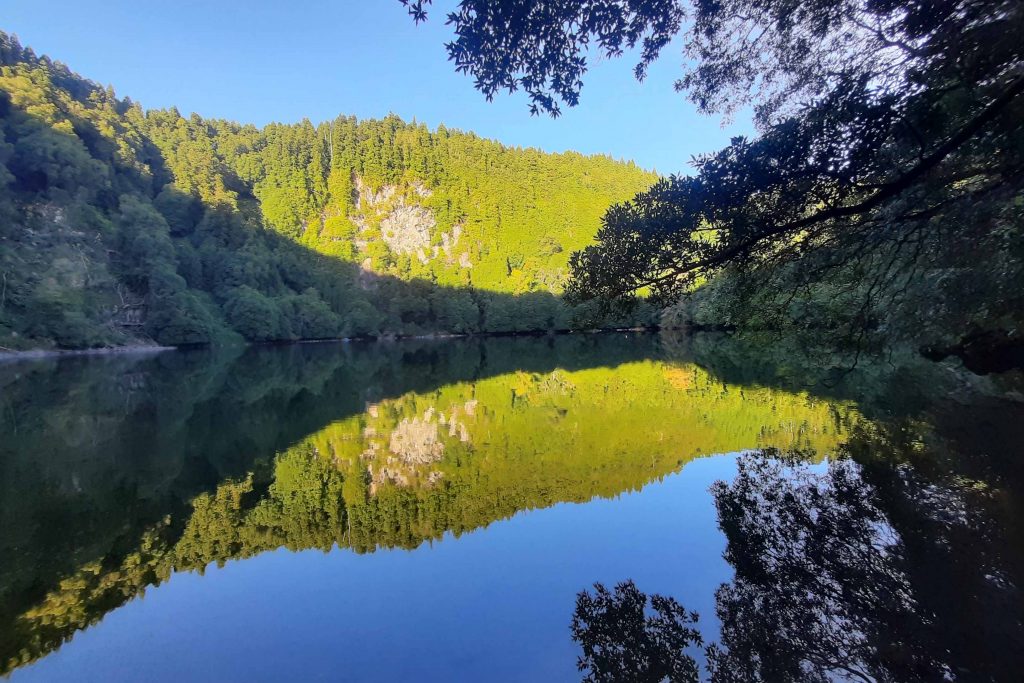 Die führte noch an einem weiteren kleinen, sehr romantisch gelegenen Vulkansee vorbei. Da haben wir das Auto geparkt und sind einen reichlich matschigen Weg gelaufen, um ihn zu sehen. Unser Fitnessprogramm für heute ist damit bestimmt erfüllt.