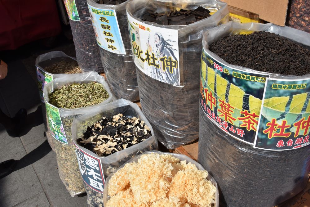 Perfekt gestärkt für den Tag sind wir erst zur Main Station gelaufen und haben uns für morgen ein Auto reserviert. Von dort aus sind wir zur Dihua-Straße: Sie liegt in einem Viertel, in dem es vor allem noch die alten Kräutergeschäfte für die chinesischen Medizin gibt. Dicke Säcke mit getrockneten Pilzen und allerlei undefinierbare Ingredienzien wurden feil geboten.