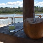 Wir erreichten einen kleinen See (Lago el Silencio), fuhren aber nach kurzen Stopp weiter zu einem kleinen Mogote mit einer Höhle: Sah malerisch aus und war vor allem hübsch kühl. Zurück am See (erstes Schwächeln: Wir haben die Räder bergauf geschoben) haben wir uns in den Schatten gesetzt und mit Zitronensaft und Kokoswasser direkt aus der Nuss die schlimmste Mittagshitze abgewartet. Nachdem ich meine Kokosnuss ausgeschlürft hatte, wurde sie mir mit einer kleinen Machete geöffnet und wir haben als Snack das Fruchtfleisch gegessen (und den Hühnern auch noch was gegönnt).