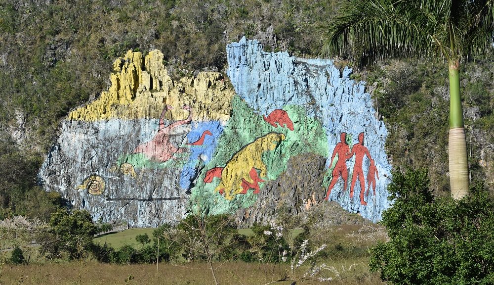 In der noch kühlen Morgensonne sind wir die 5 Kilometer flott zum Mural de la Prehistoria geradelt: Ein riesiges Felsenbild, welches die Evolutionsgeschichte bis zur Menschheit darstellt. Entstanden ist es in den 1961 – 1965 und wird alle paar Jahre erneuert.
