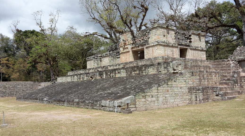 In aller Frühe ging es heute in Antigua los: um 4:00 Uhr hat uns der Shuttlebus vom Hotel abgeholt. Nach langer Fahrt mit 2 kurzen Pausen waren wir gegen 11:00 Uhr an der Grenze nach Honduras angekommen. Wie im Reiseführer beschrieben, beschleunigten die 2 Wörter „Solo Copán! “ die Ausreise aus Guatemala und die Einreise nach Honduras erheblich: statt diverse Zettelchen auszufüllen wie unsere Mitreisenden wurden wir in ein Hinterzimmerchen gebeten und nach Abdrücken von 6 US-Dollar bekamen wir unsere Stempel mit dem Hinweis: auf dem Rückweg könnt Ihr einfach durchlaufen. Auch gut…