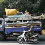 Wir haben Bagan wieder verlassen: Ein Transporter sammelte uns am Hotel ein. Die Rucksäcke wurden aufs Dach gehievt und vertäut. Mit ein paar weiteren Haltestationen, bei denen Mensch und diverse Güter ein- bzw aufgeladen wurden, war der Bus dann gut gefüllt. Zwei Fahrer wechselten sich auf der Fahrt ab: Der eine fuhr und der andere hatte seinen Platz beim Gepäck auf dem Dach.