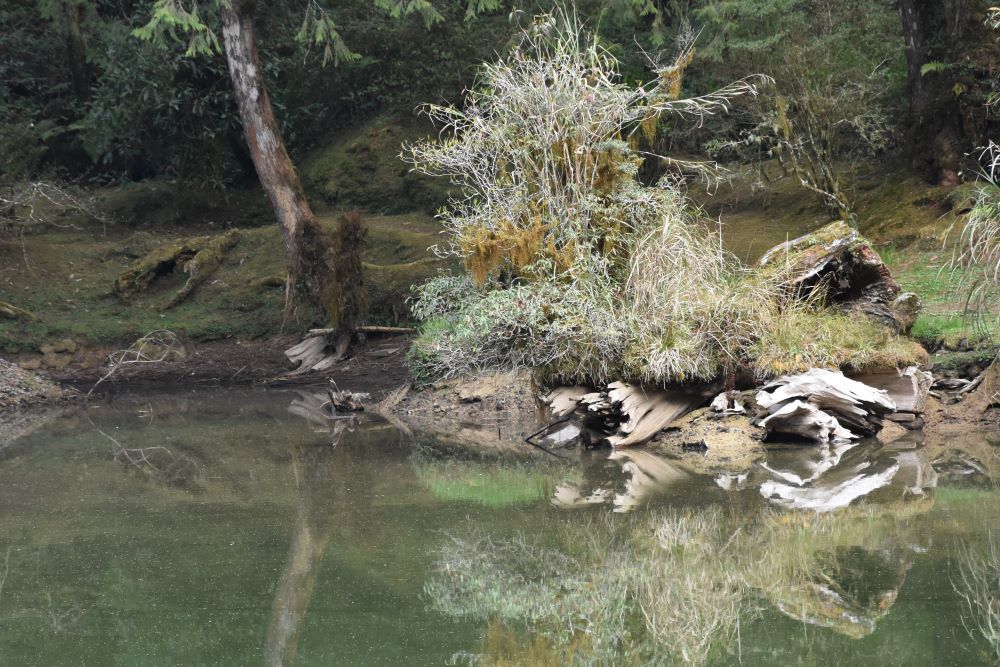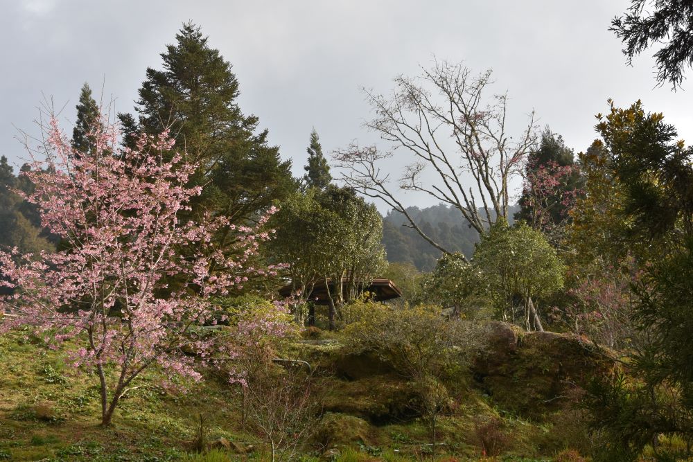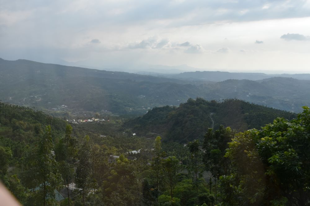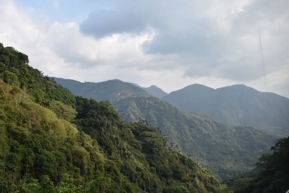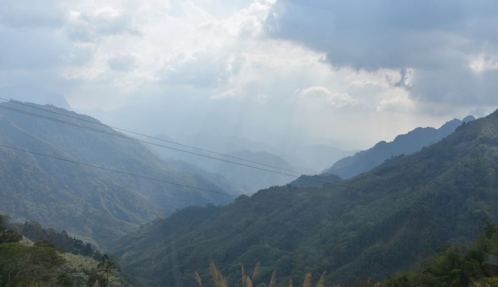 Über eine kurvige Bergstrecke haben wir Alishan erreicht. Lange Zeit sind wir an einem gewaltigen ausgetrockneten Flussbett entlang gefahren. Zwar floss gerade nur ein Bächlein hinunter, aber die großen Flusssteine zeugen davon, mit welcher Kraft und Wucht das Wasser herabrauschen kann. Bagger haben an verschiedenen Stellen Kiesel herausgeholt: Es wird sicherlich als Baumaterial verwendet. Und seitlich gab es immer wieder kleine Felder, die es vermutlich bei der nächsten Flutung wegschwemmt. Irgendwann sind wir abgebogen und der Bus kletterte tapfer in vielen Kurven auf einen Pass in 2600 Metern Höhe. Steil fallen die Berghänge ab und sind an vielen Stellen abrutschgefährdet. Es gibt viele Straßenüberbauungen und Hangabsicherungen, damit die Straße nicht verschüttet wird.