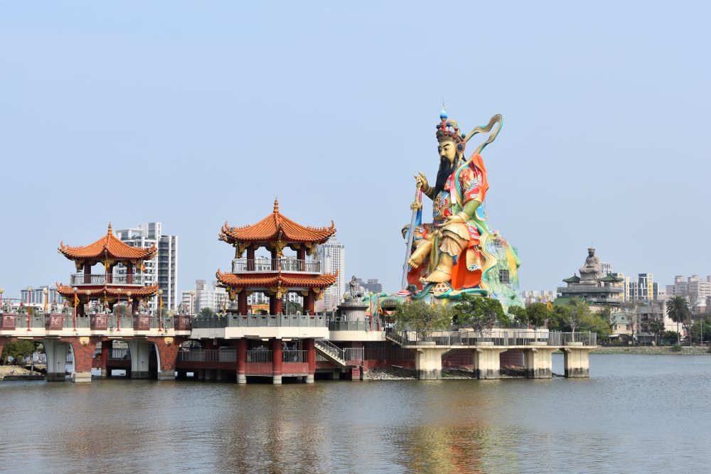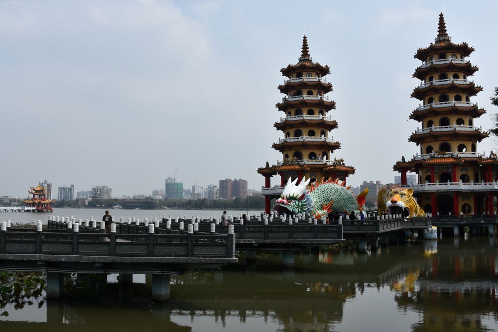 Wir sind wieder weitergezogen und sind per Zug in Kaohsiung gelandet. Das Gepäck haben wir im Hotel deponiert und sind losgezogen bei 29 °C. Pflichtprogramm ist der Lotus See, an dem gleich mehrere große Tempel und Pagoden liegen.